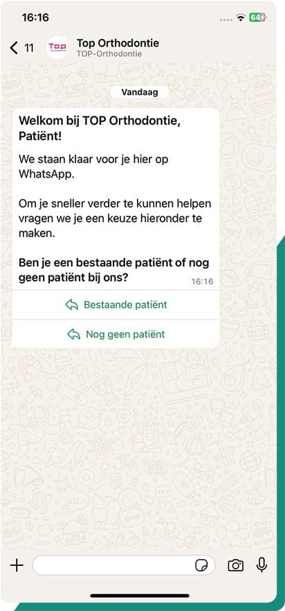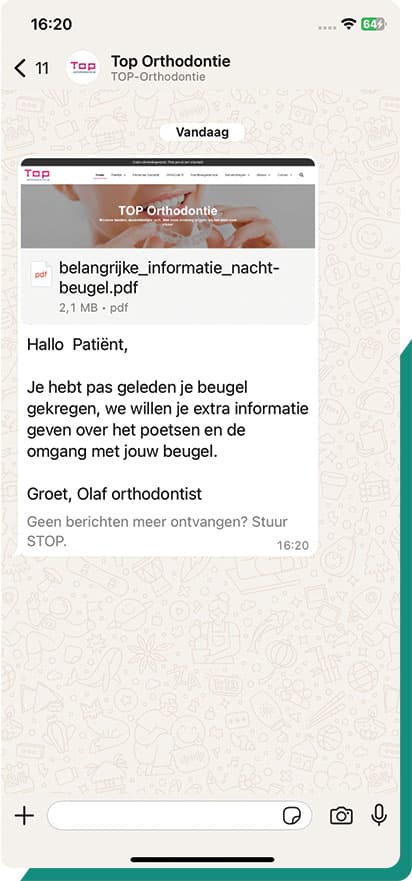 Daarnaast stuurt Top Orthodontie afspraakherinneringen via WhatsApp, zodat patiënten tijdig op hun afspraak worden geattendeerd. Dit vermindert het aantal no-shows en zorgt ervoor dat de agenda optimaal wordt benut.