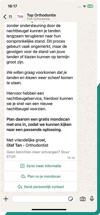 Ook heeft Top Orthodontie een nachtbeugelservice opgezet met een effectief WhatsApp-bericht dat gericht is op het behouden van het resultaat van een beugelbehandeling. Dit bericht, verstuurd naar patiënten die hun nachtbeugel mogelijk verloren hebben, biedt hen een gratis mondscan en de mogelijkheid om snel een nieuwe nachtbeugel te regelen. Het resultaat? Een conversieratio van gemiddeld 10% onder ontvangers van dit bericht.